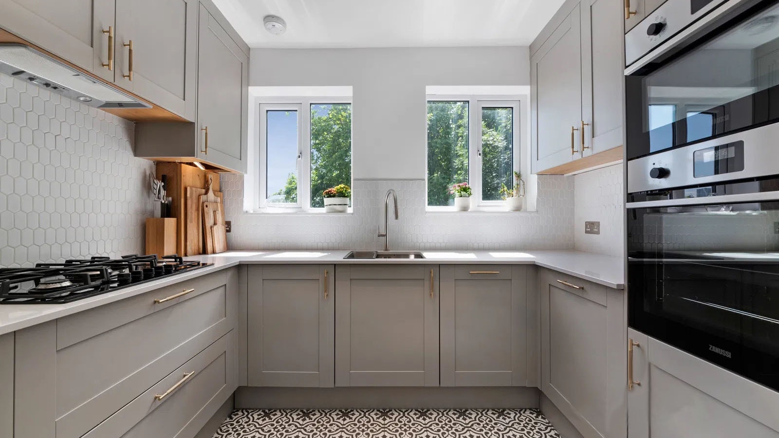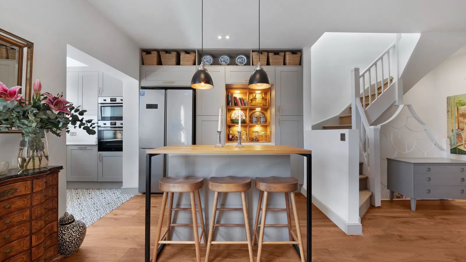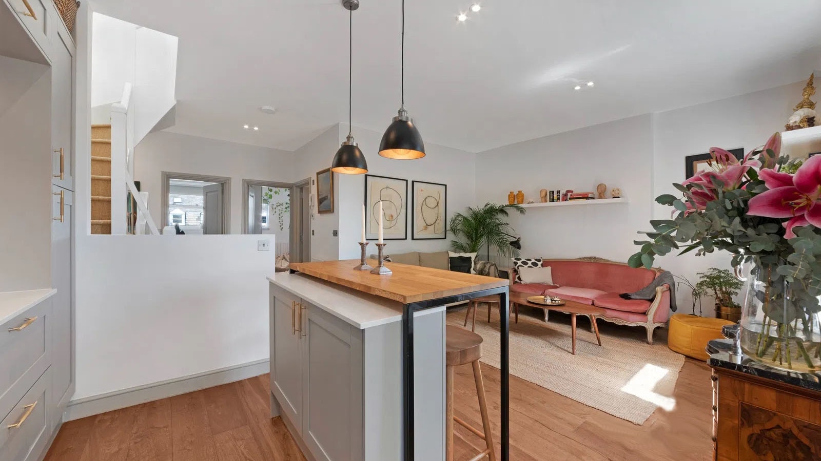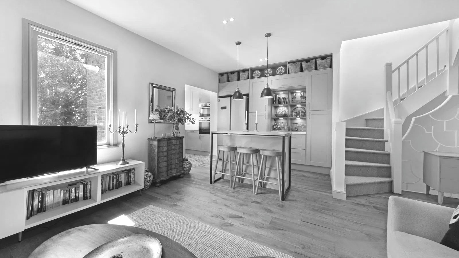 A calm, neutral material palette was chosen to enhance the sense of space — warm engineered oak flooring, soft-toned walls, and bespoke joinery crafted to introduce texture and depth without overwhelming the interiors. The kitchen was redesigned as a focal point, featuring clean-lined cabinetry, integrated appliances, and understated stone worktops that combine elegance with functionality.