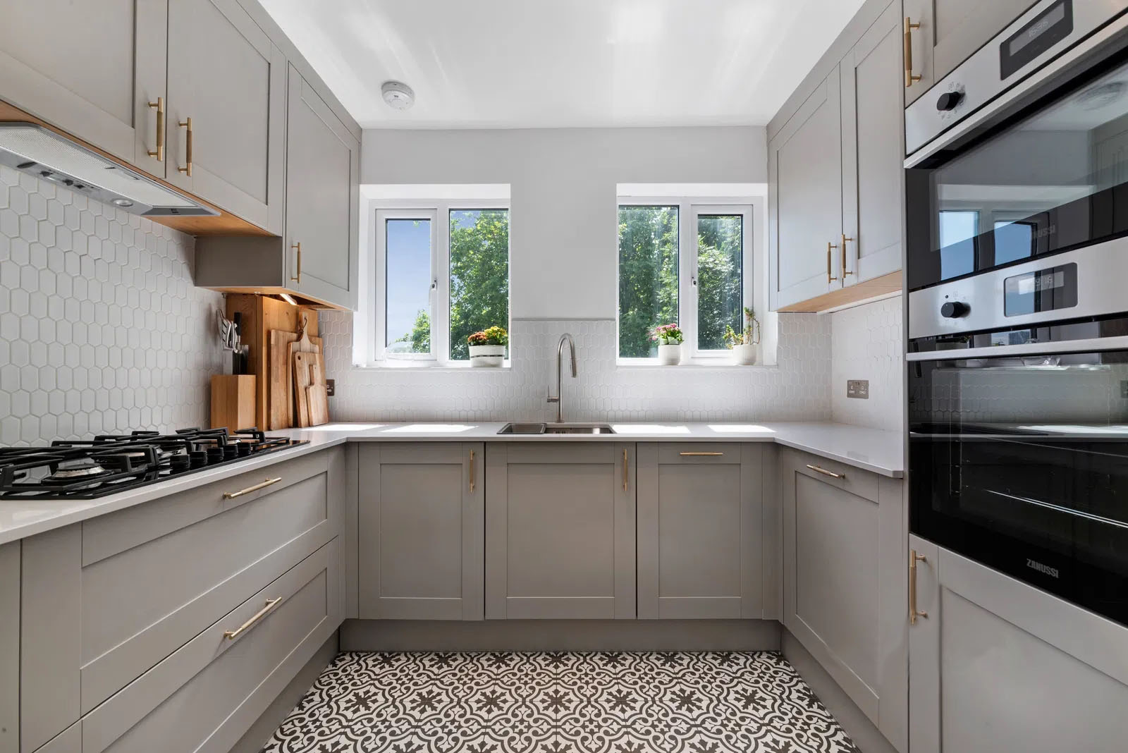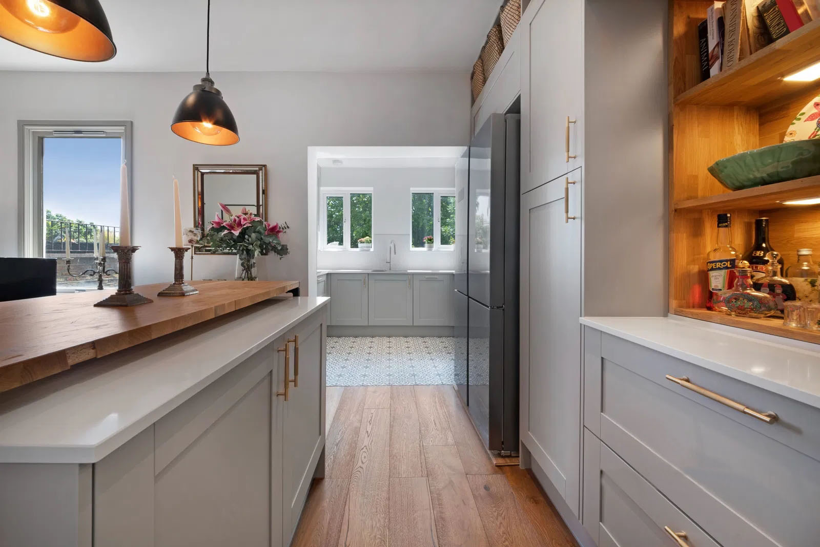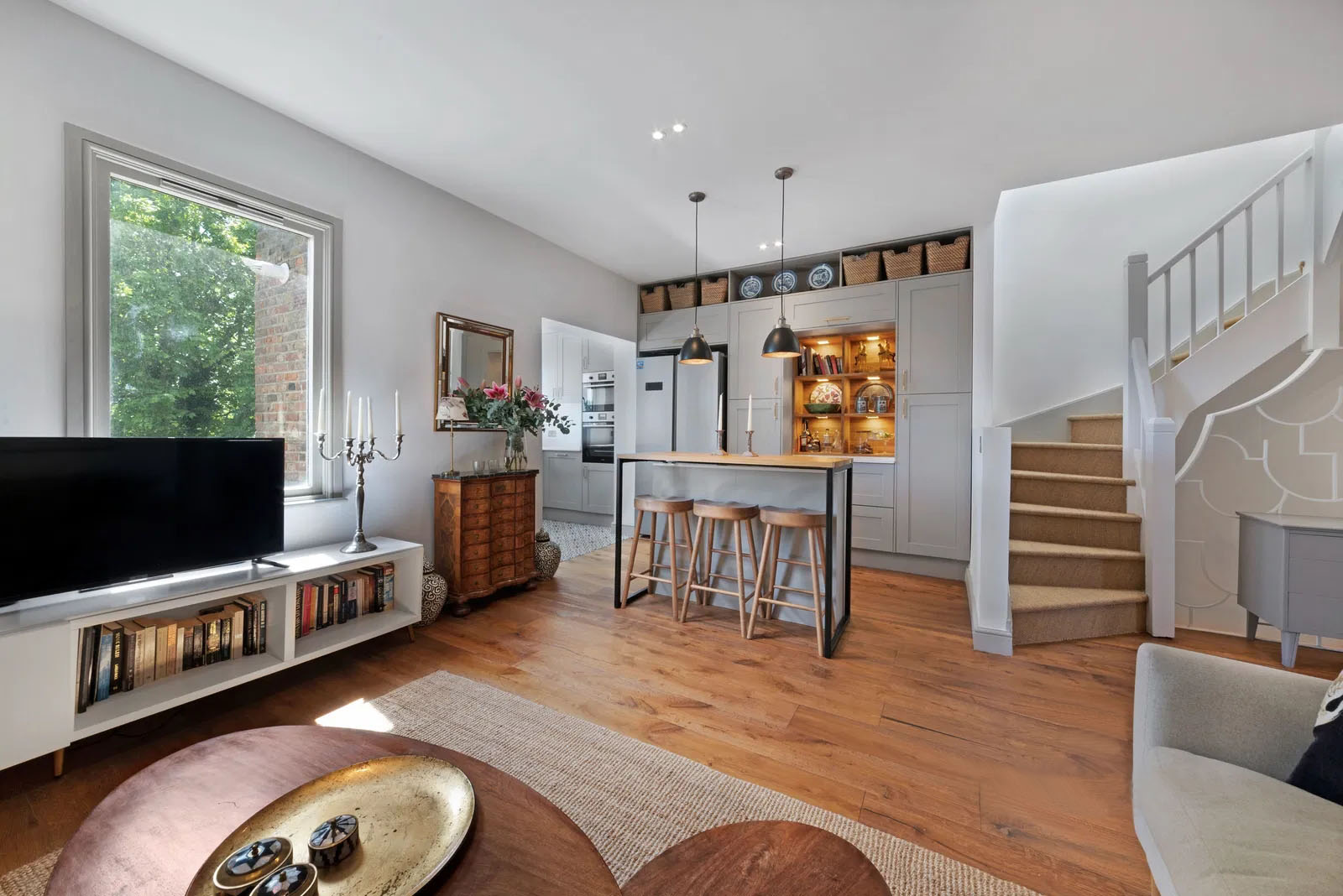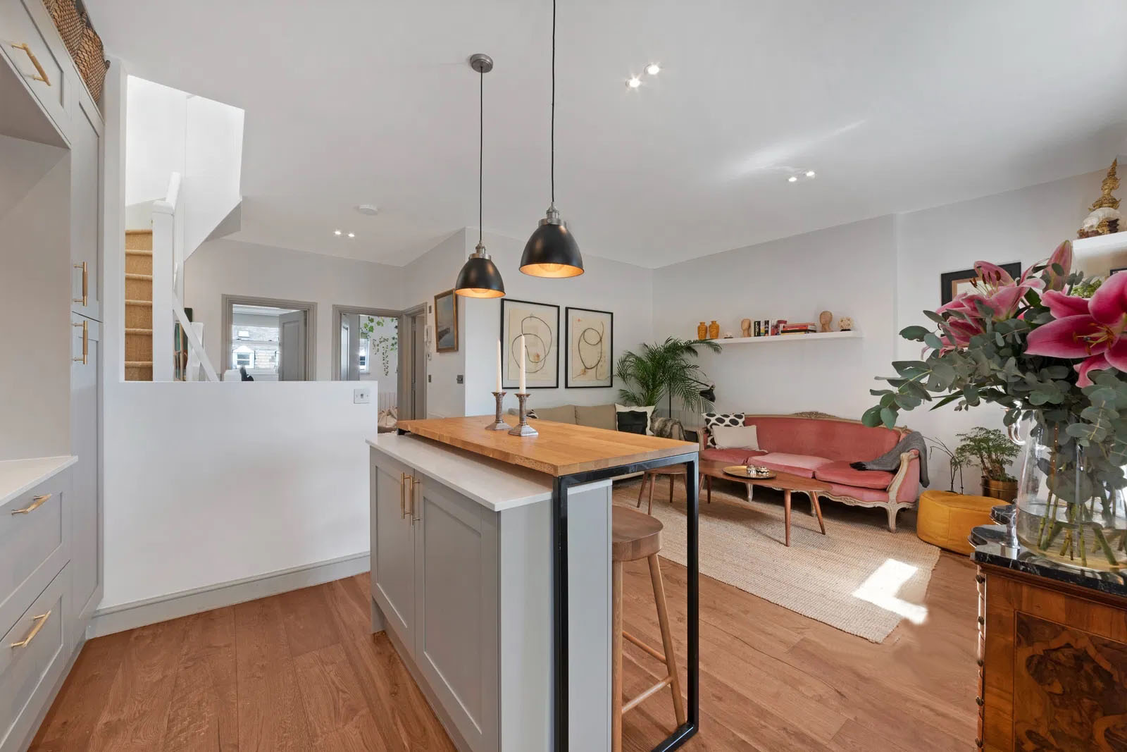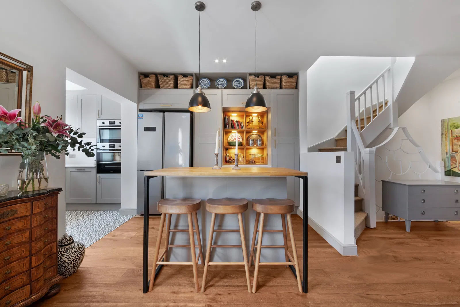 A calm, neutral material palette was chosen to enhance the sense of space — warm engineered oak flooring, soft-toned walls, and bespoke joinery crafted to introduce texture and depth without overwhelming the interiors. The kitchen was redesigned as a focal point, featuring clean-lined cabinetry, integrated appliances, and understated stone worktops that combine elegance with functionality.