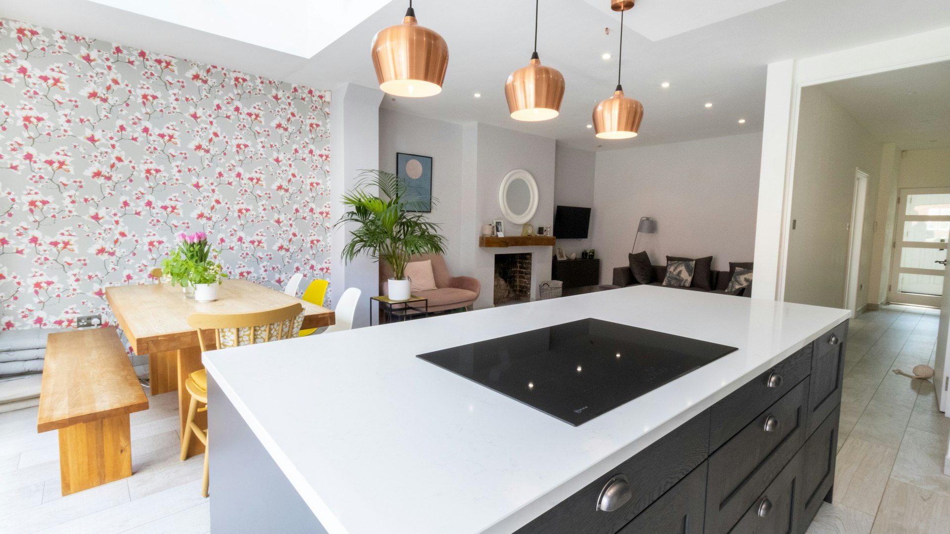 Alongside the structural works, the property underwent a full renovation. All electrics were replaced throughout, and a completely new plumbing and heating system was installed to modern standards. The ground floor benefits from underfloor heating beneath a tiled finish, delivering both comfort and a clean, contemporary aesthetic.