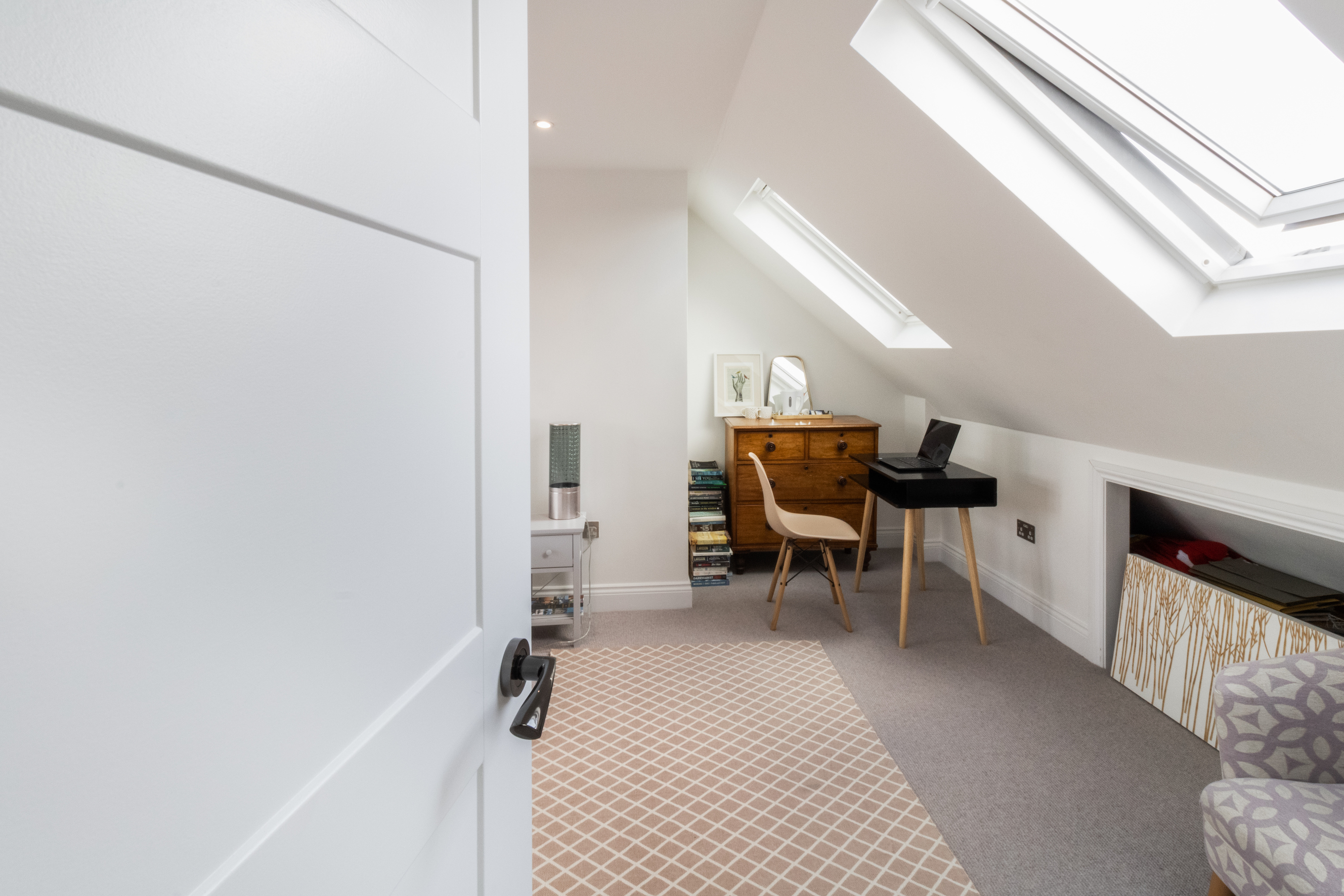 The project began with the construction of a large loft conversion, forming a generous new principal suite complete with a contemporary en suite bathroom and extensive built-in storage. Clever space planning within the roof structure maximised head height and usable floor area, while bespoke joinery ensured ample, discreet storage solutions.