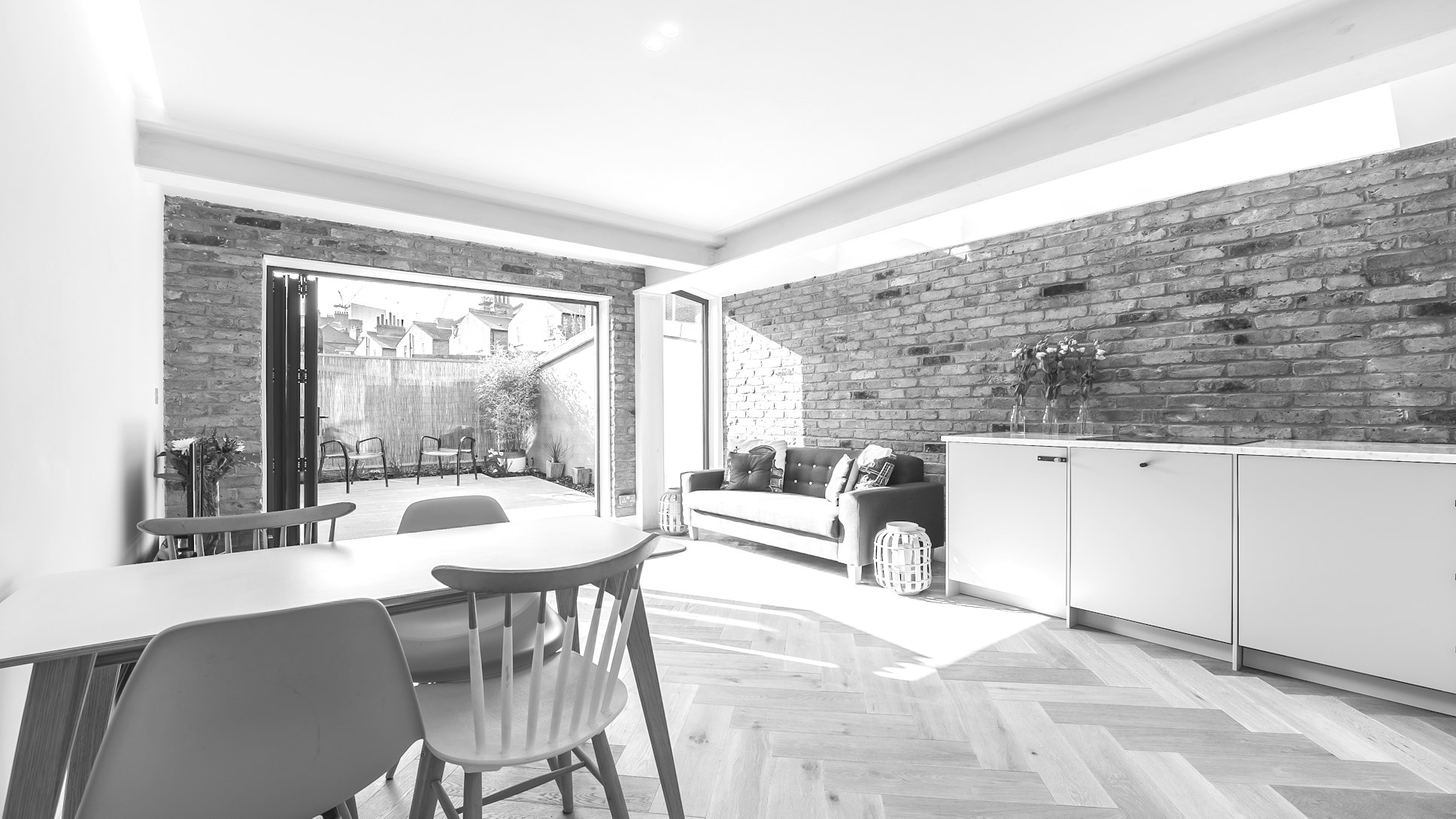 The new open-plan space has been carefully designed to maximise natural light and enhance flow, with large glazed openings connecting the interior to a private garden. The kitchen features streamlined cabinetry and integrated appliances, seamlessly blending into the living and dining zones to create a cohesive and versatile environment ideal for both relaxing and entertaining.