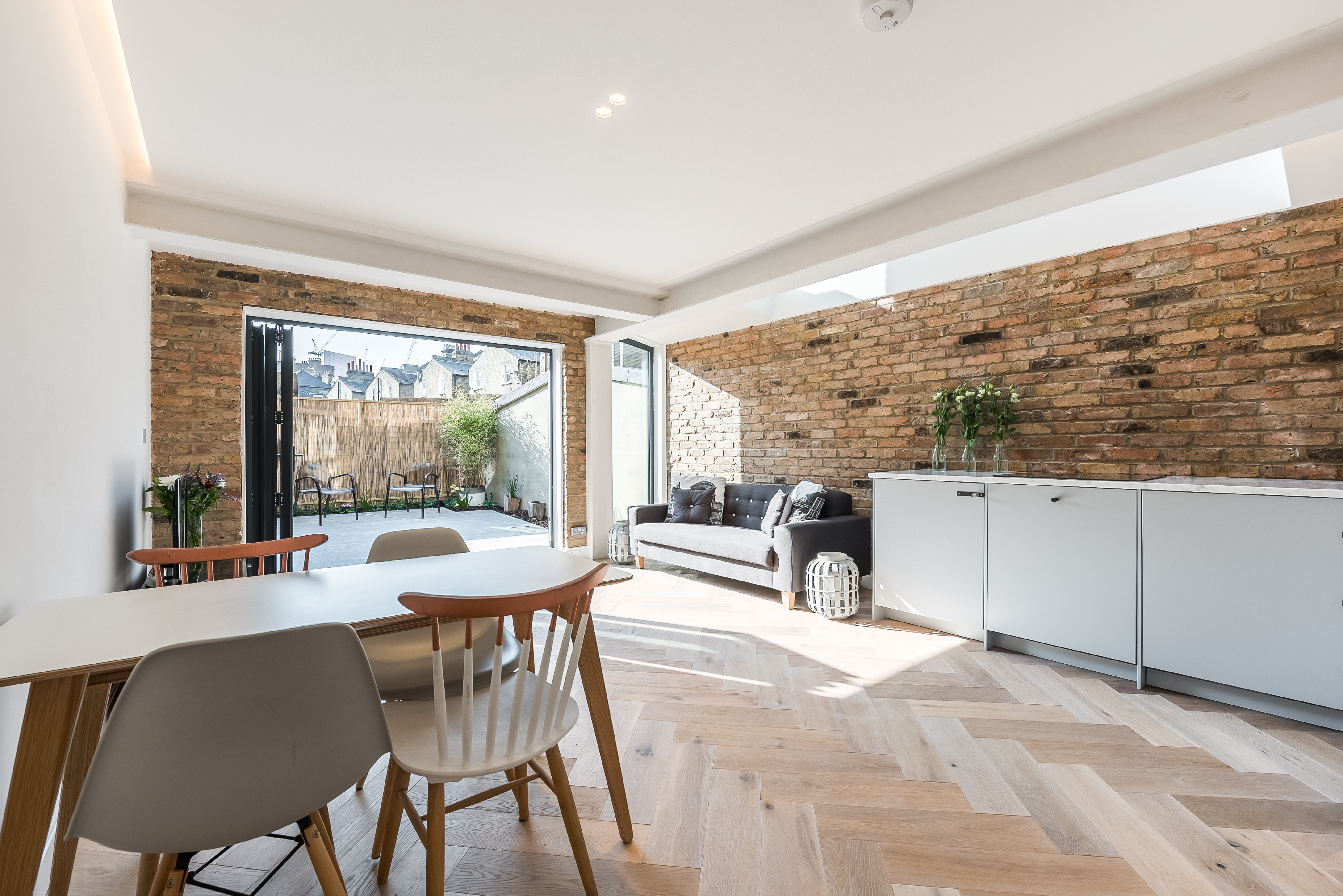 The new open-plan space has been carefully designed to maximise natural light and enhance flow, with large glazed openings connecting the interior to a private garden. The kitchen features streamlined cabinetry and integrated appliances, seamlessly blending into the living and dining zones to create a cohesive and versatile environment ideal for both relaxing and entertaining.